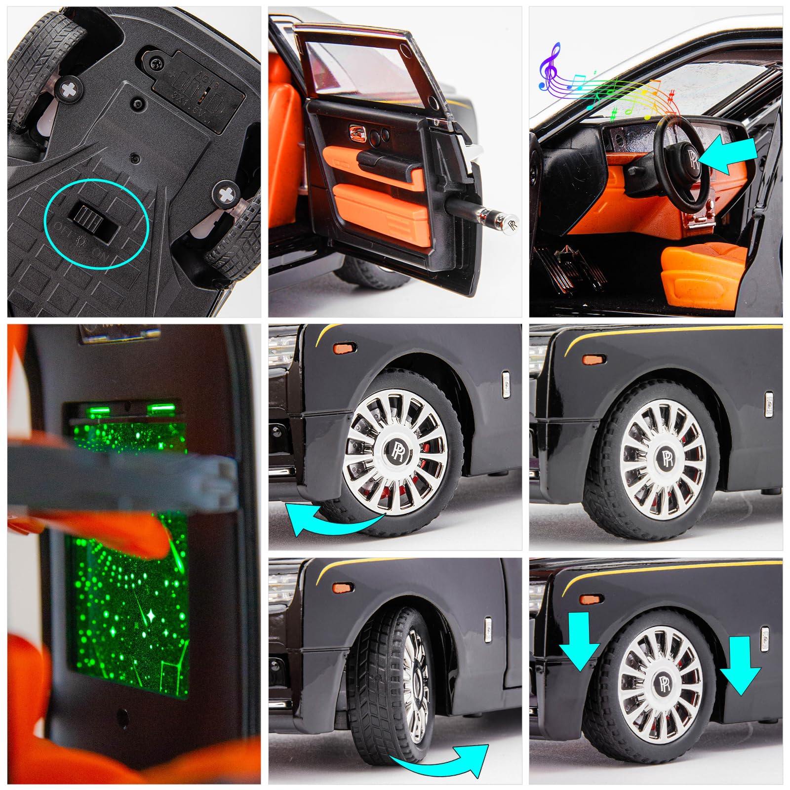 Instructions for use:The car has a three-position switch at the bottom of the car for on, off, and lighting mode. Turn on the switch to turn on the lights and sound effects. Switch to light mode for lights only and no sound effects. This Rolls Royce Phantom toy car has a lot of freedom with the four doors that open, as well as the front hood and rear trunk. The trunk is large enough to hold other small toys. There is a round button at the bottom of the front of the car that can be pressed to open the hood. After the hood is opened, the Rolls-Royce logo, the Jubilee Statue, can be erected. The umbrella that comes with the car can also be taken out. Even the fuel tank can be opened. Equipped with many different sound effects and dazzling colorful lights.