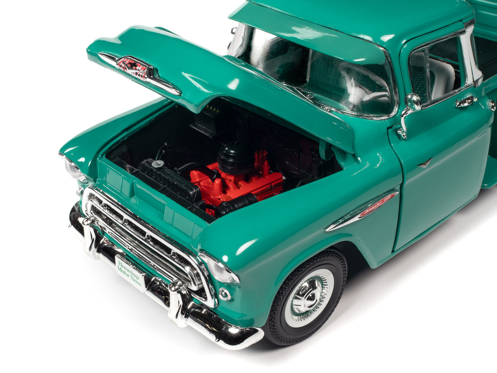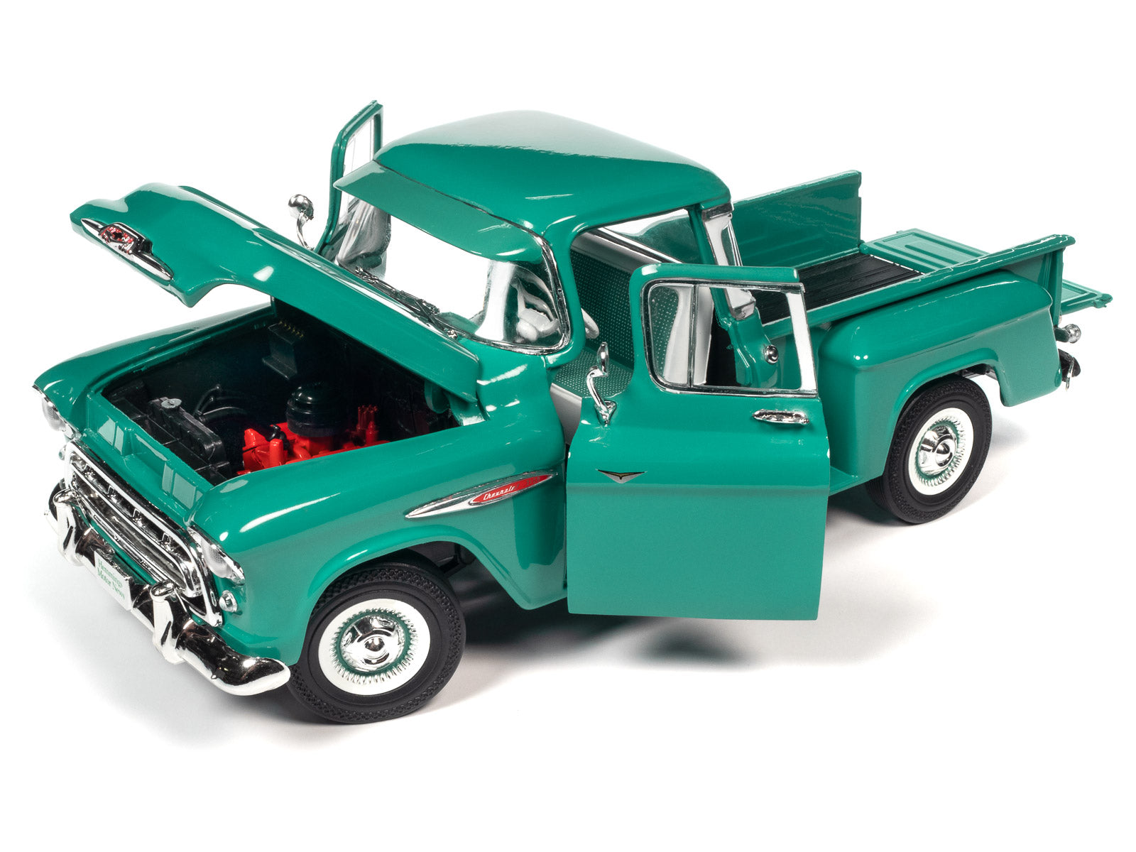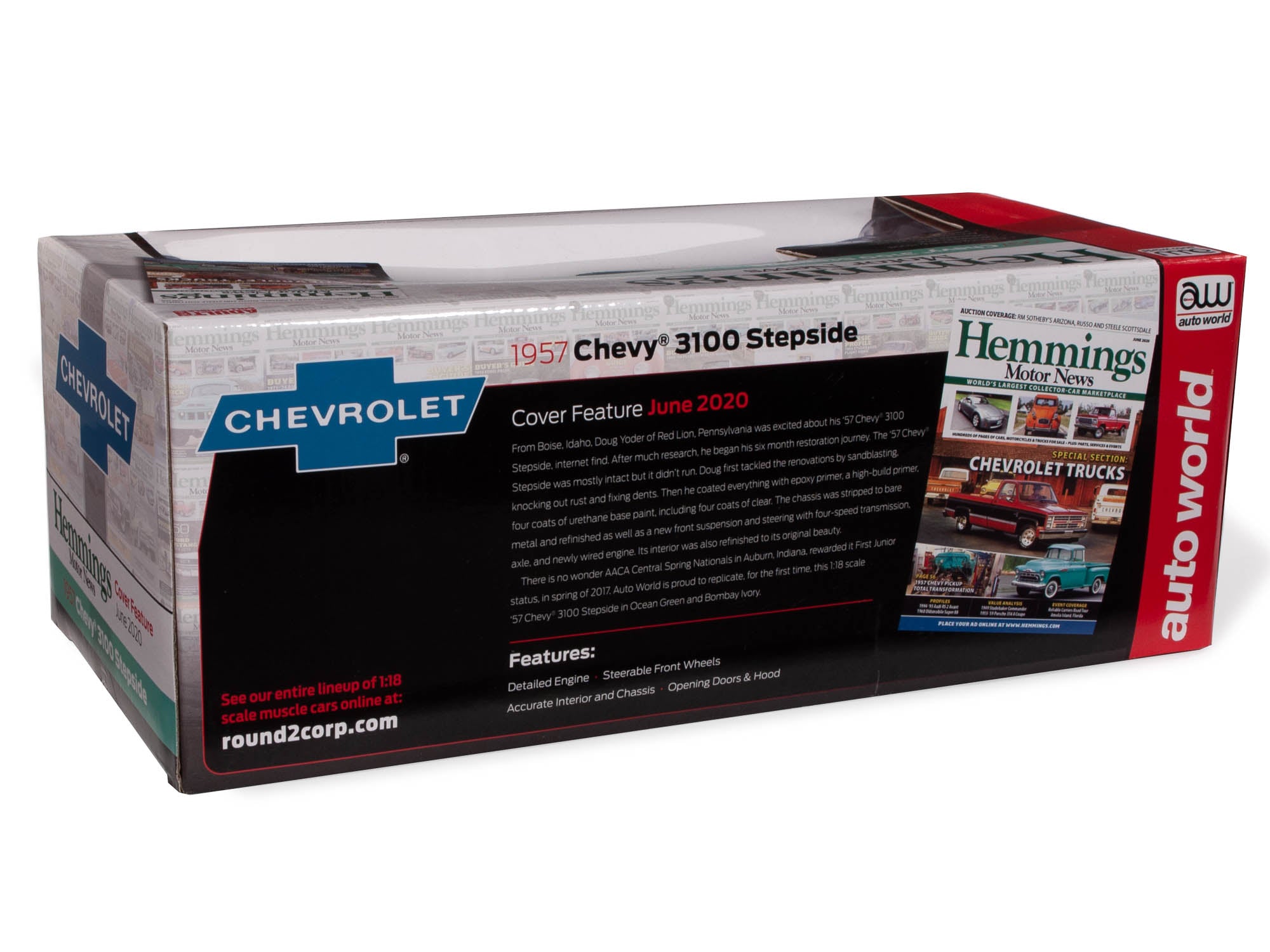 From Boise, Idaho, Doug Yoder of Red Lion, Pennsylvania was excited about his ‘57 Chevy 3100 Stepside, internet find. After much research, he began his six month restoration journey. The ‘57 Chevy Stepside was mostly intact but it didn’t run. Doug first tackled the renovations by sandblasting, knocking out rust and fixing dents. Then he coated everything with epoxy primer, a high-build primer, four coats of urethane base paint, including four coats of clear. The chassis was stripped to bare metal and refinished as well as a new front suspension and steering with four-speed transmission, axle, and newly wired engine. Its interior was also refinished to its original beauty. There is no wonder AACA Central Spring Nationals in Auburn, Indiana, rewarded it First Junior status, in spring of 2017. Auto World is proud to replicate, for the first time, this 1:18 scale ‘57 Chevy® 3100 Stepside in Ocean Green and Bombay Ivory.