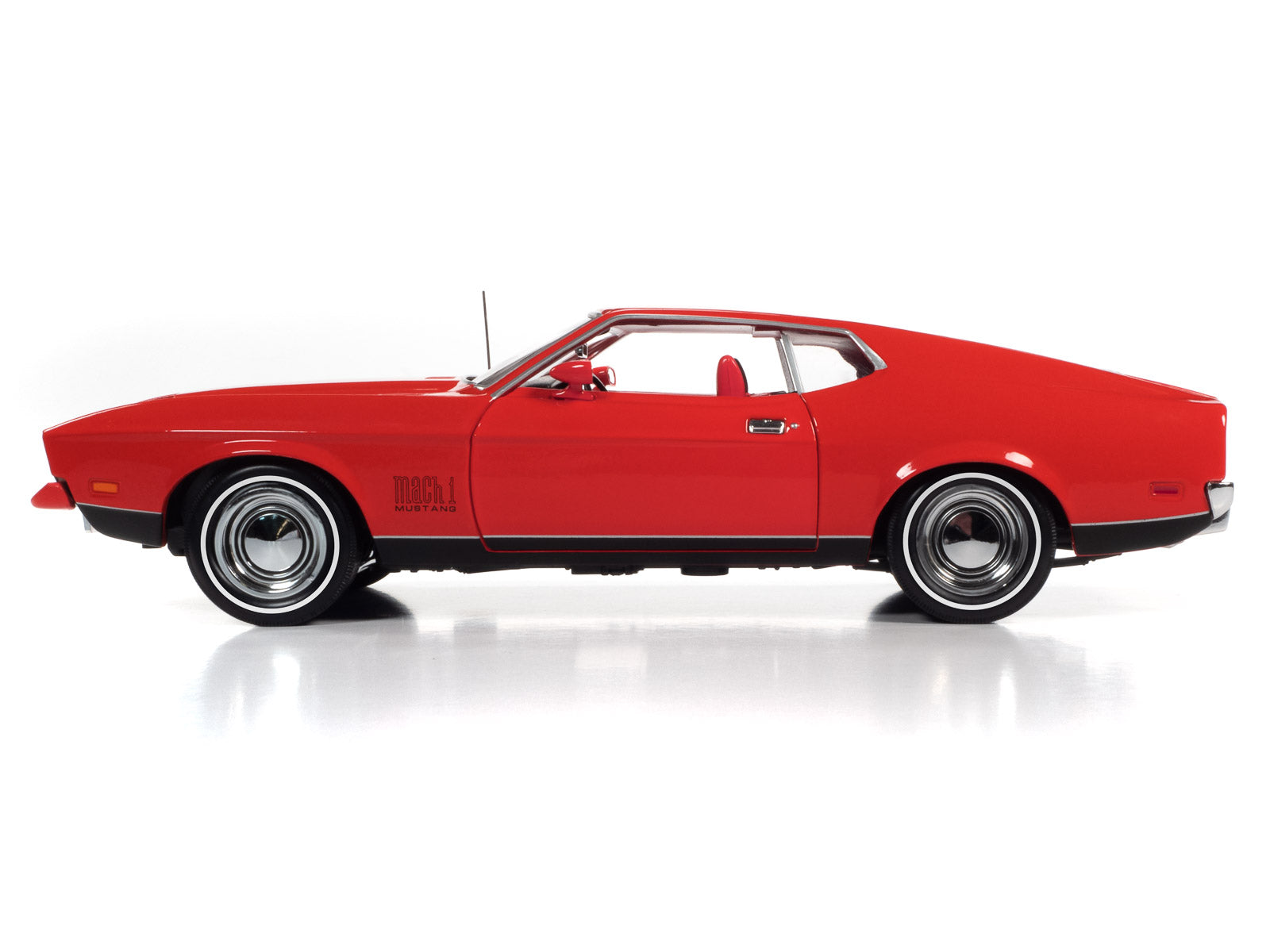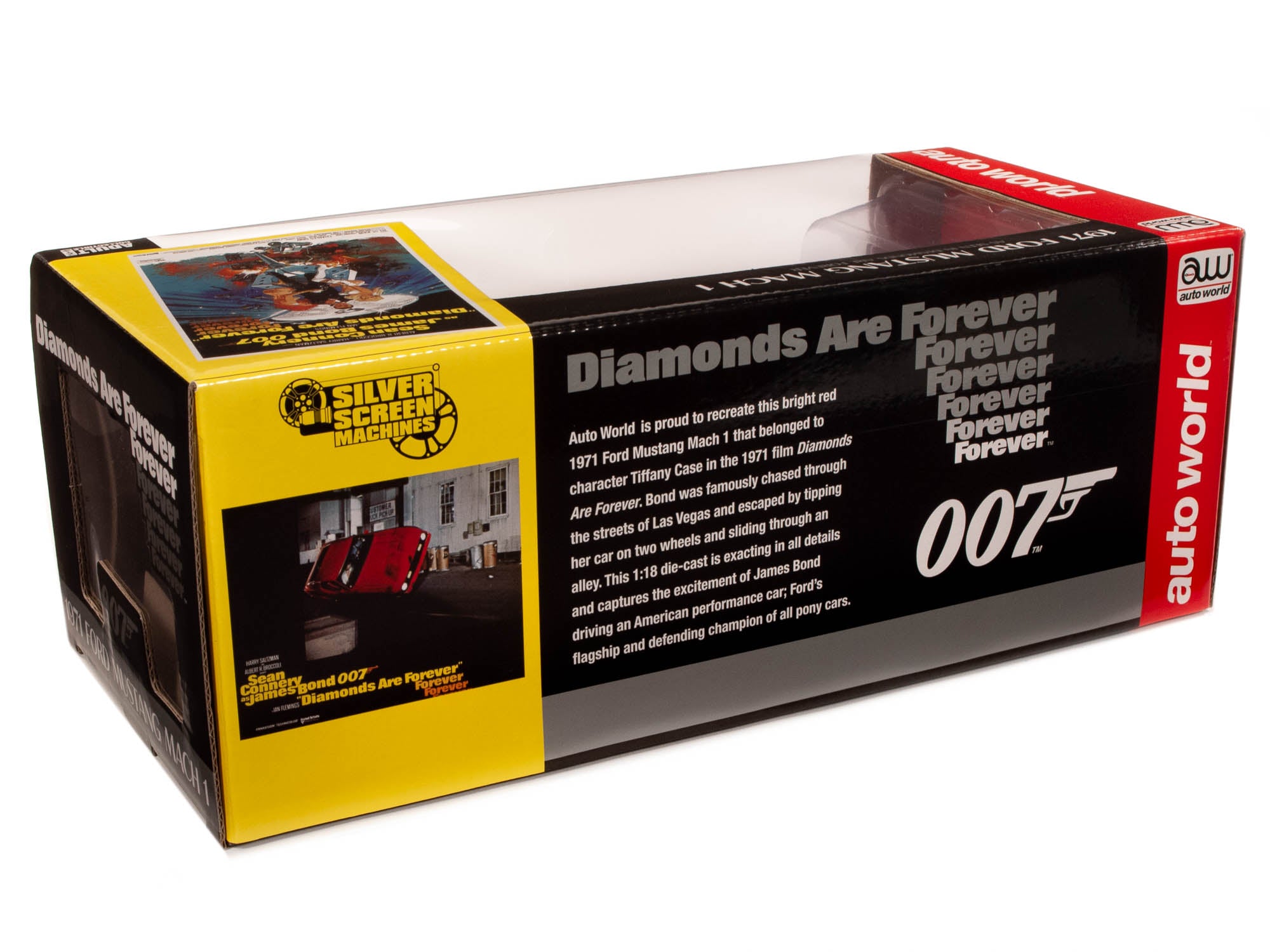 Auto World is proud to recreate this bright red 1971 Ford Mustang Mach 1 that belonged to character Tiffany Case in the 1971 film Diamonds Are Forever. Bond was famously chased through the streets of Las Vegas and escaped by tipping her car on two wheels and sliding through an alley. This 1:18 die-cast is exacting in all details and captures the excitement of James Bond driving an American performance car; Ford’s flagship and defending champion of all pony cars.