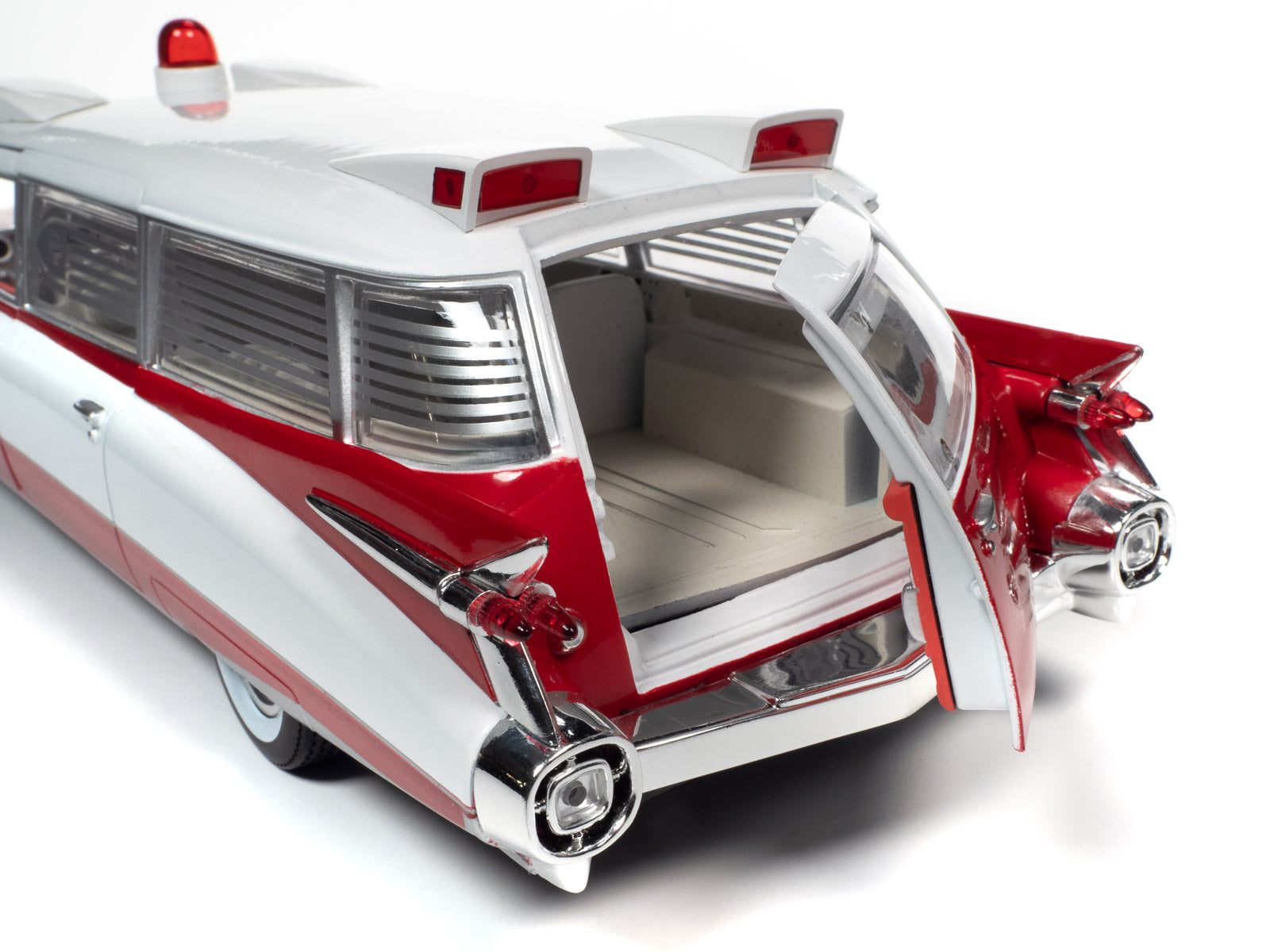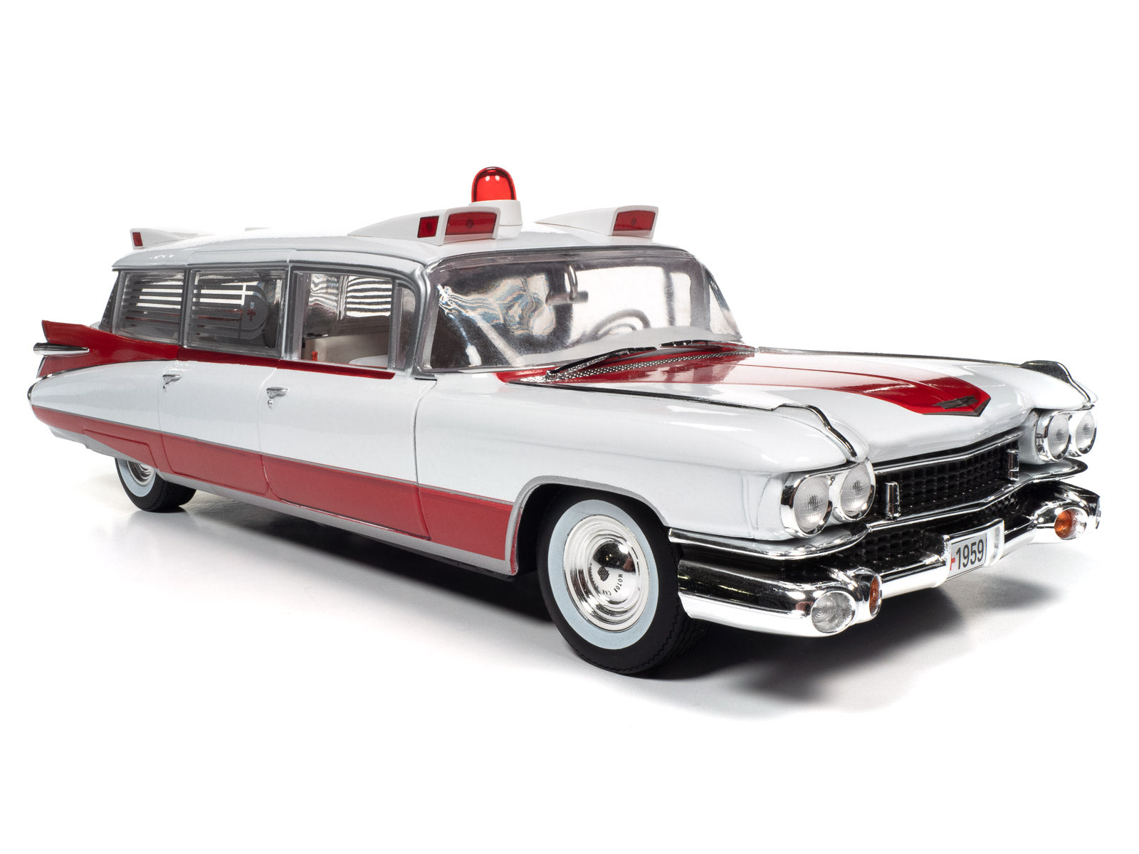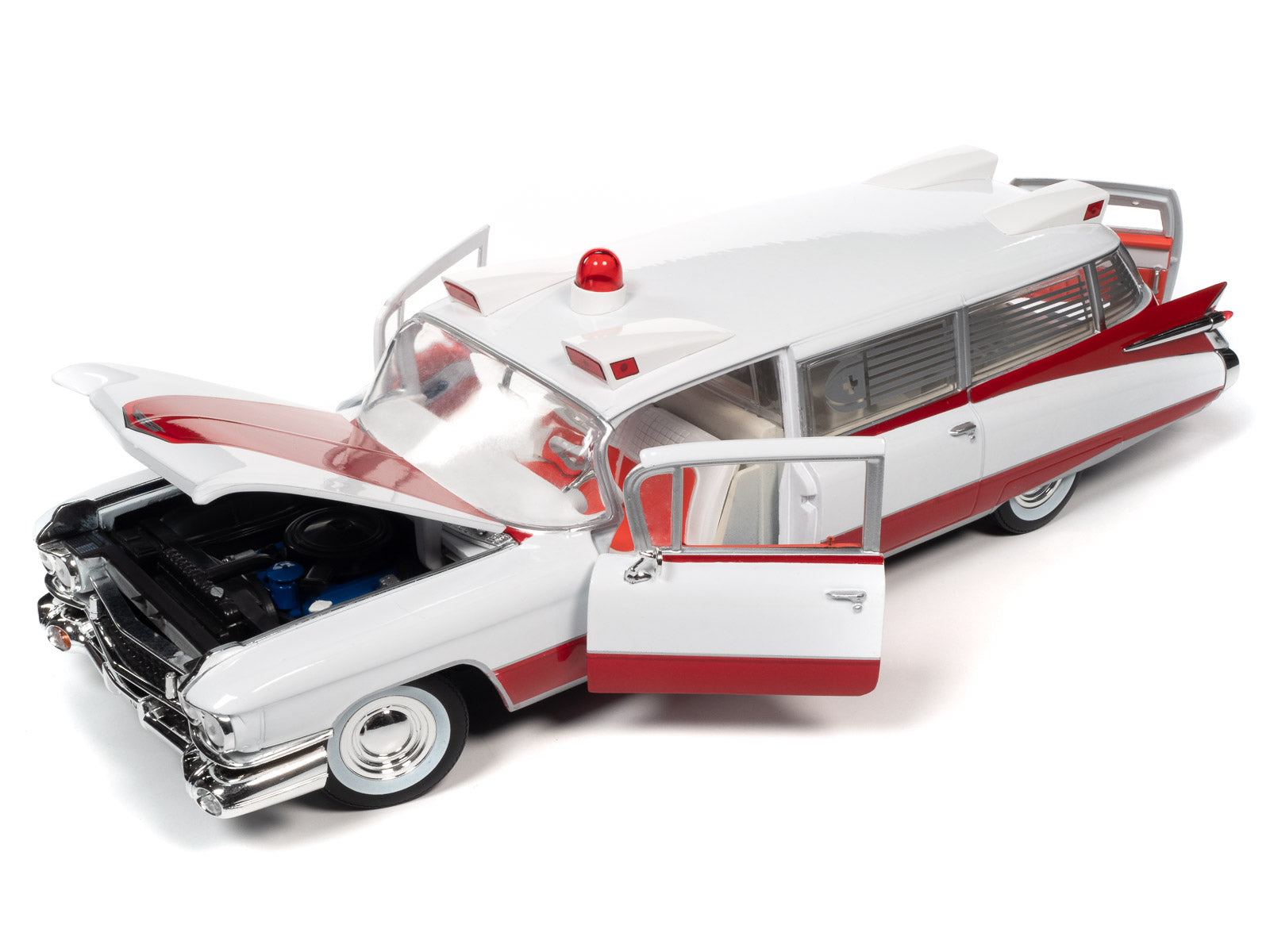 For the first time, Auto World has replicated this 1959 Cadillac Ambulance in 1:18 scale! This die-cast shares the iconic tailfins from the 1959 Cadillac Eldorado. Mounted to the roof is a NEWLY TOOLED bubble light flanked by red-lensed emergency flasher housings on all four corners. Featuring period-correct red and white two-tone paint, this iconic 50s ambulance is ready to resuscitate your die-cast collection!