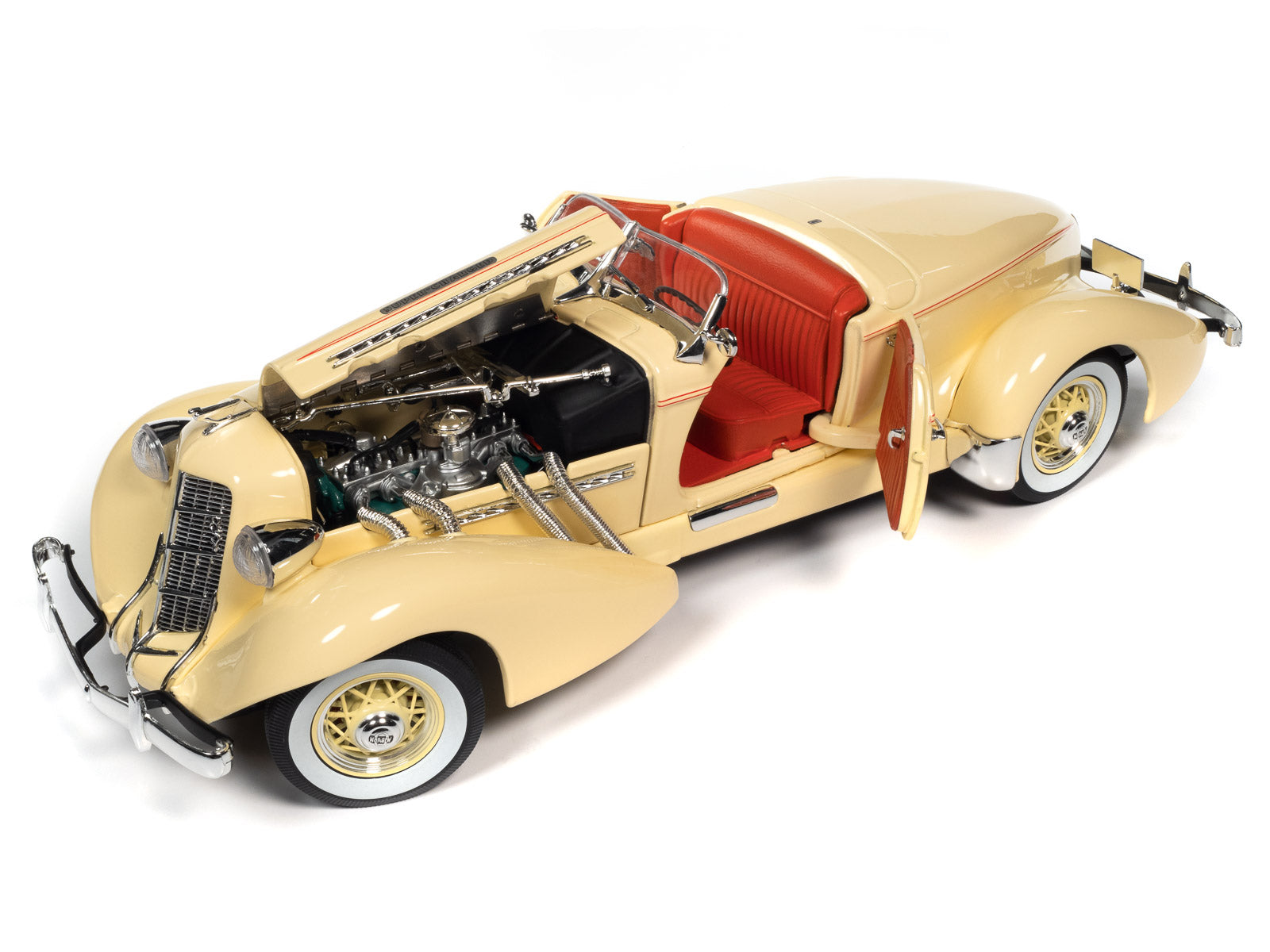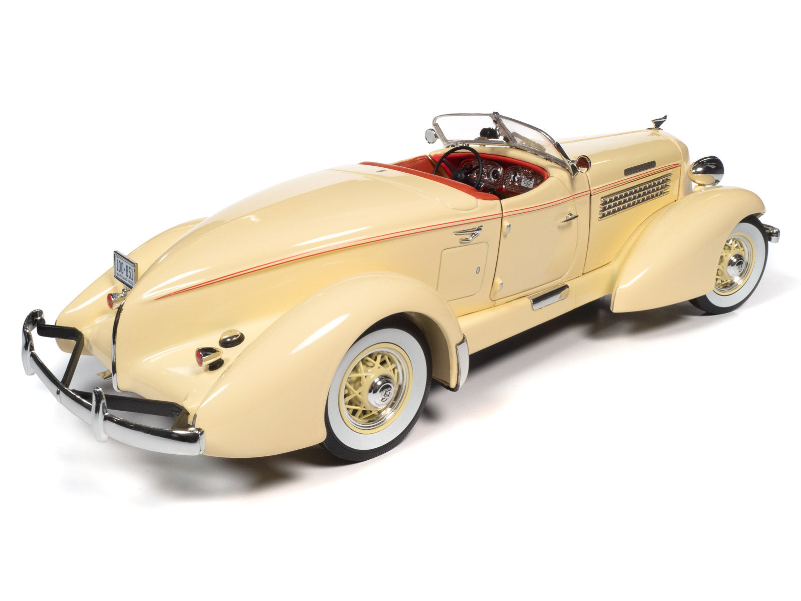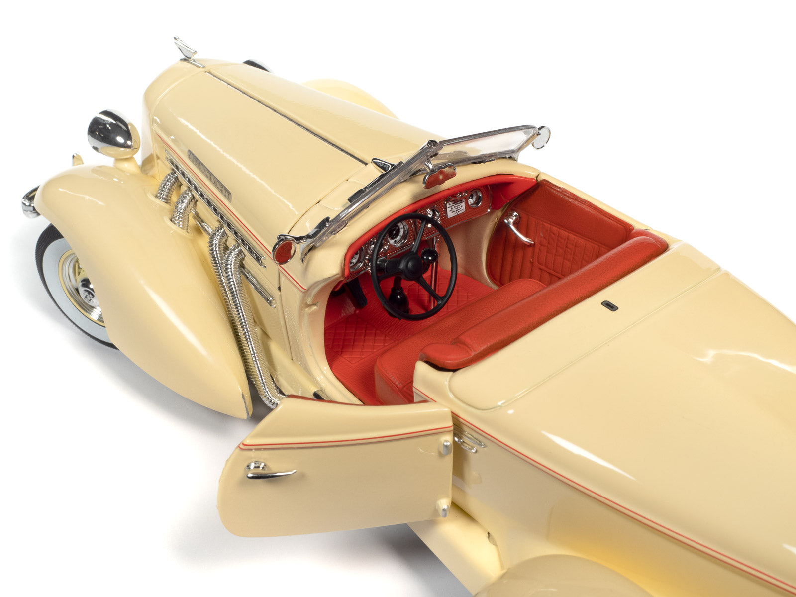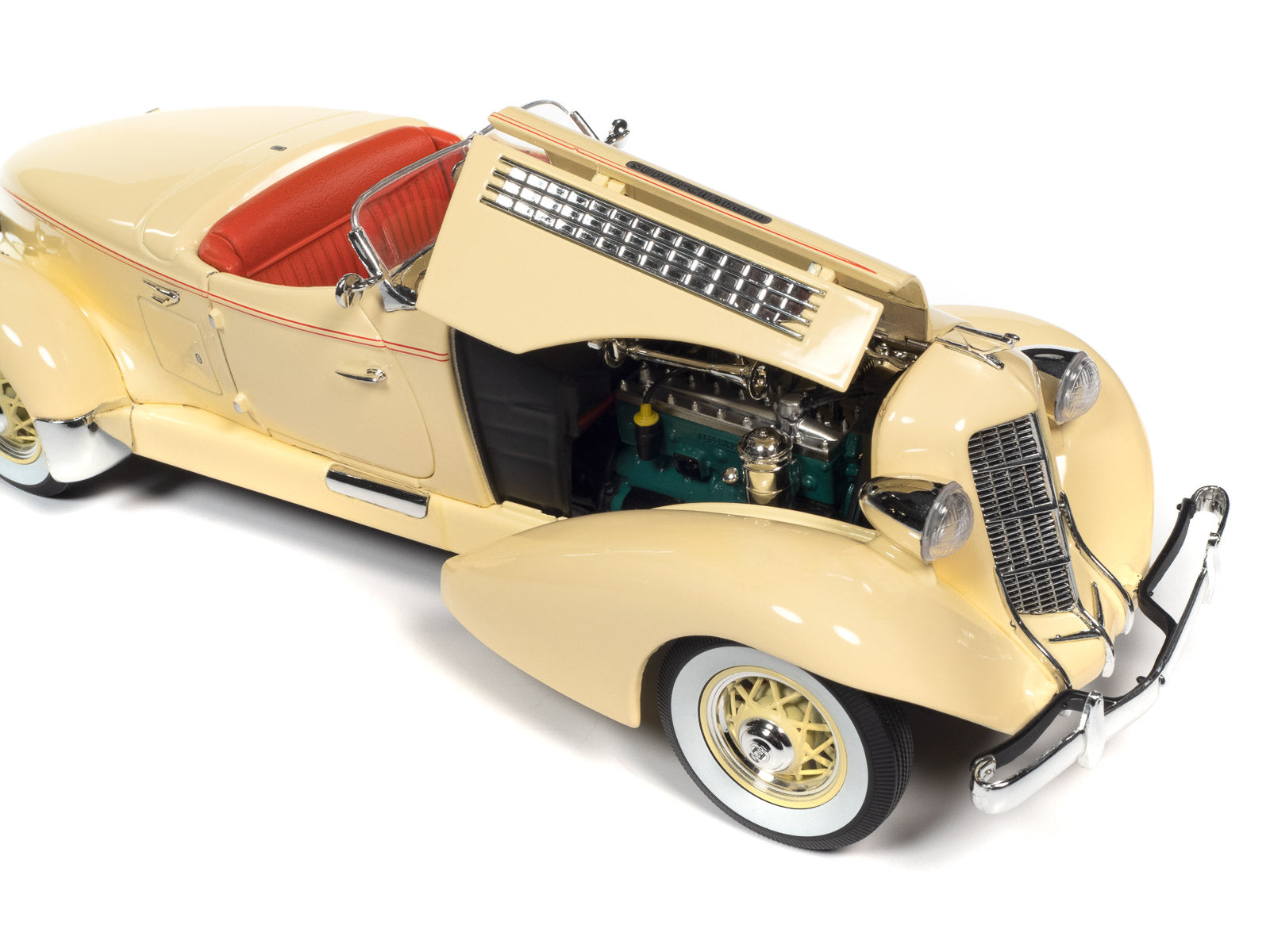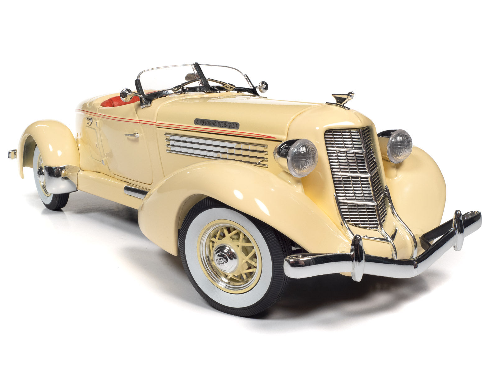 Joining the Auburn Motor Company in 1934, Gordon Buehrig set forth to design what many consider his masterpiece, the 851 Speedster. The sweeping lines and the low boattail rear end influenced vehicles such as the 1963-67 Chevy Corvette and the 1971-73 Buick Riviera™. Its voluptuous good looks were stoutly backed up with impressive performance from the supercharged Lycoming eight-cylinder engine producing 150hp. For 1935, this was absolutely top-tier. Pairing this power with a Columbia dual-ratio rear axle meant one thing... speed. The Auburn 851 Speedster was the first car to exceed 100mph for 12 hours straight. In fact, it was guaranteed to exceed that speed directly from the factory. Today, it is one of the most collectible American vehicles, and now available as a 1:18 scale diecast model car from Auto World Store.