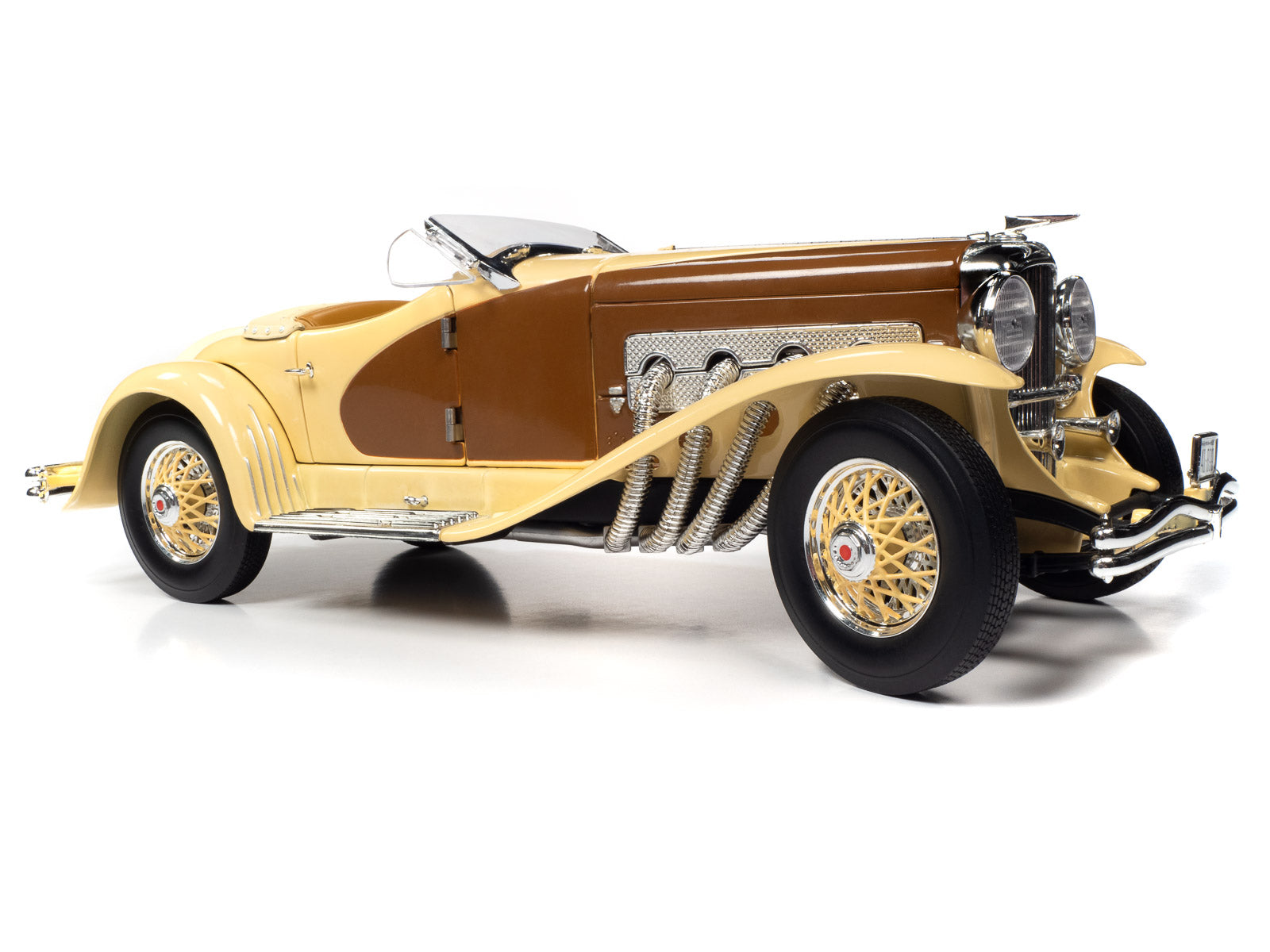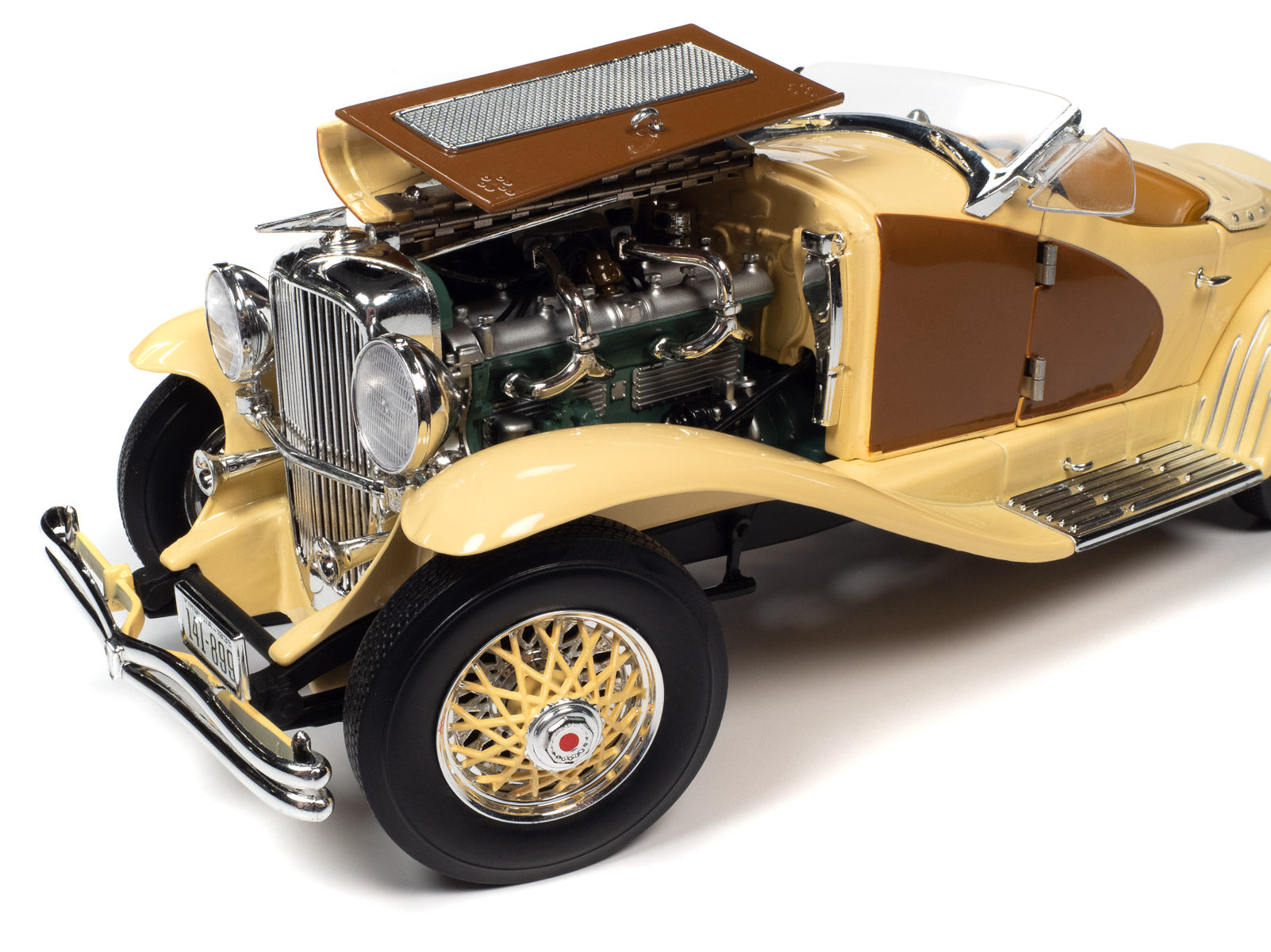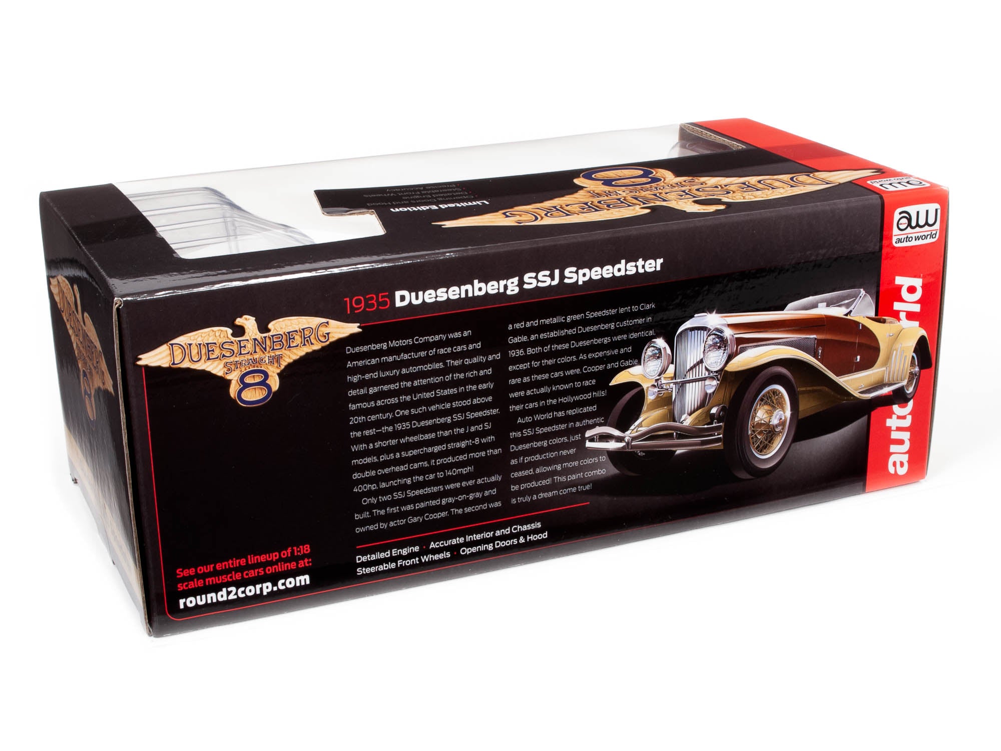 Only two SSJ Speedsters were ever actually built. The first was painted gray-on-gray and owned by actor Gary Cooper. The second was a red and metallic green Speedster lent to Clark Gable, an established Duesenberg customer in 1936. Both of these Duesenbergs were identical, except for their colors. As expensive and rare as these cars were, Cooper and Gable were actually known to race their cars in the Hollywood hills! Auto World has replicated this SSJ Speedster in authentic Duesenberg colors, just as if production never ceased, allowing more colors to be produced! This paint combo is truly a dream come true!