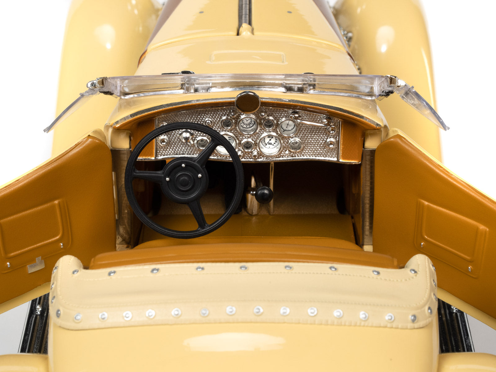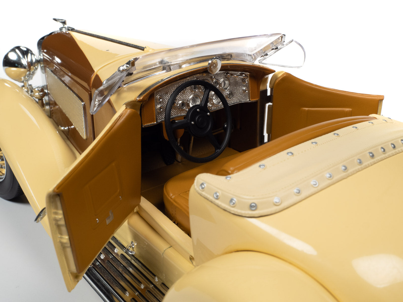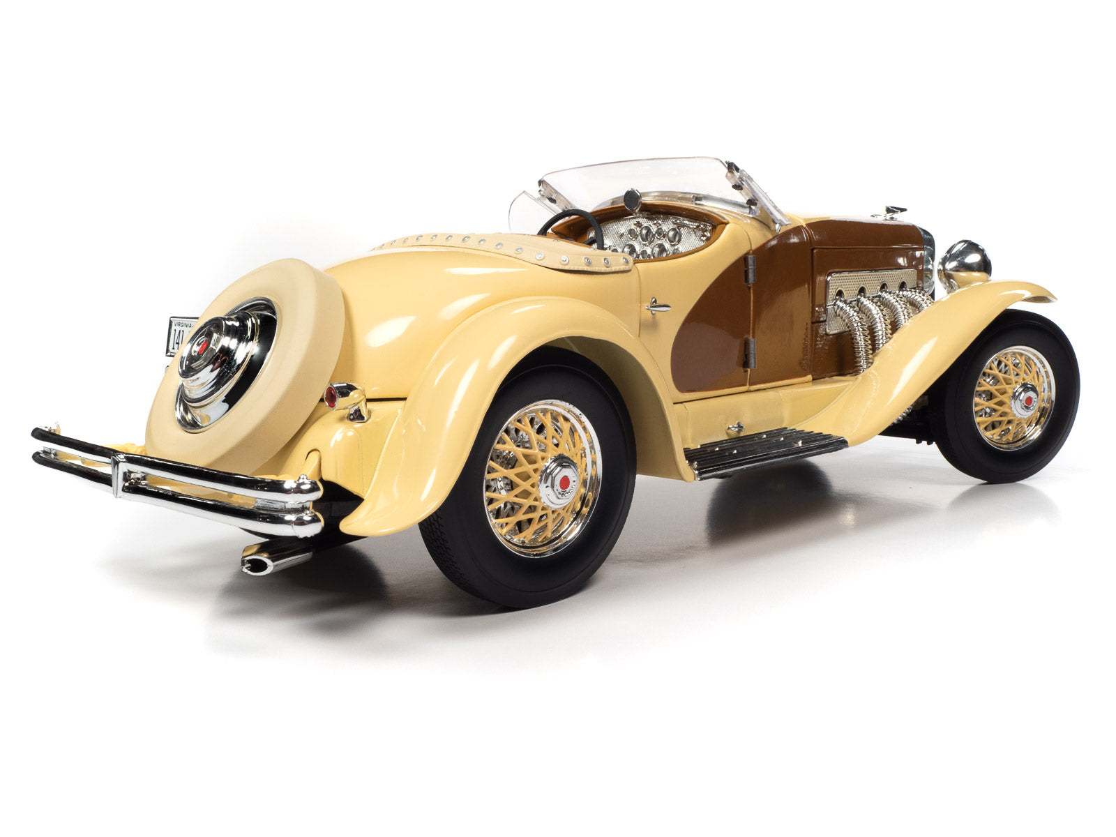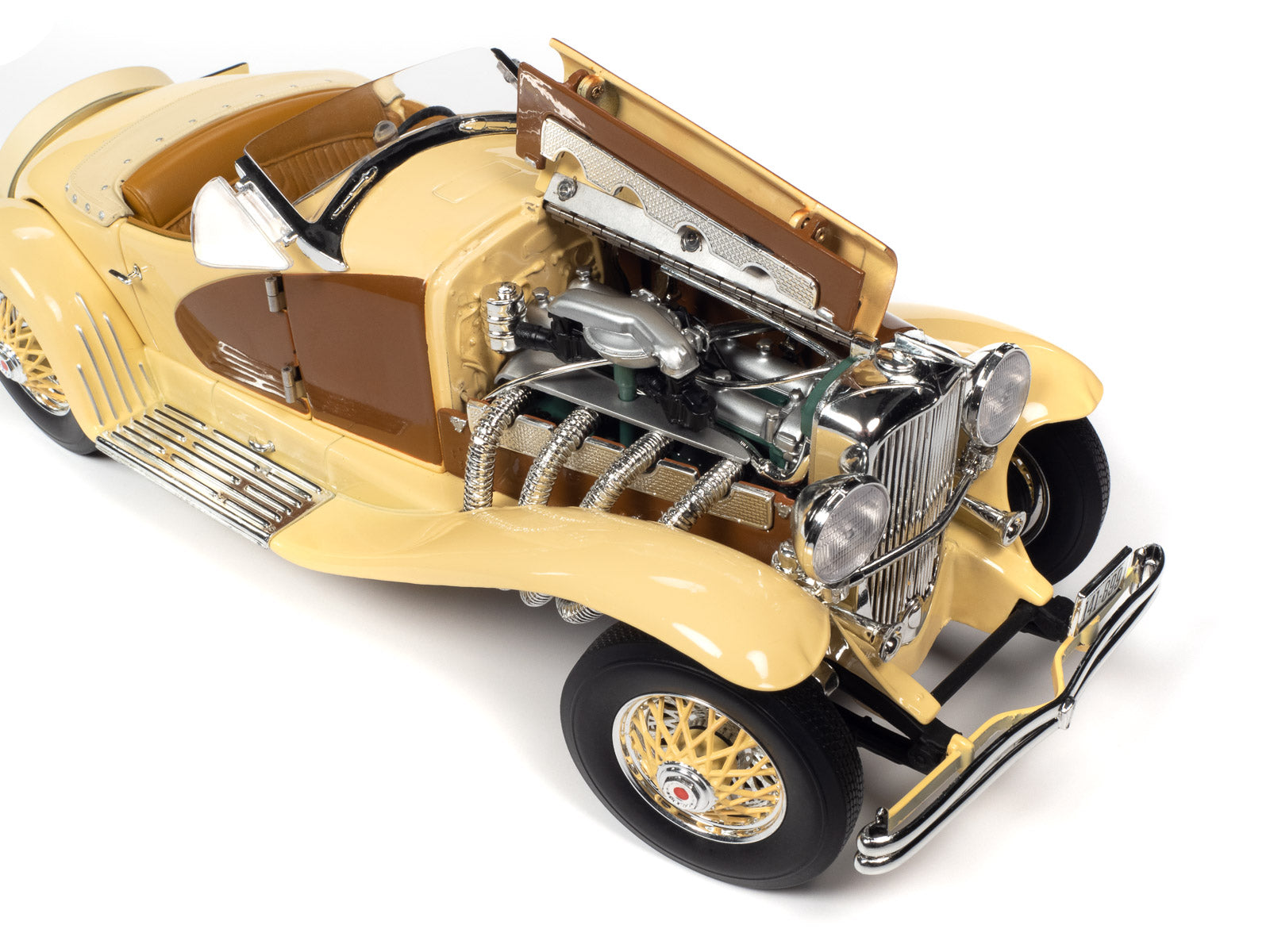 Only two SSJ Speedsters were ever actually built. The first was painted gray-on-gray and owned by actor Gary Cooper. The second was a red and metallic green Speedster lent to Clark Gable, an established Duesenberg customer in 1936. Both of these Duesenbergs were identical, except for their colors. As expensive and rare as these cars were, Cooper and Gable were actually known to race their cars in the Hollywood hills! Auto World has replicated this SSJ Speedster in authentic Duesenberg colors, just as if production never ceased, allowing more colors to be produced! This paint combo is truly a dream come true!