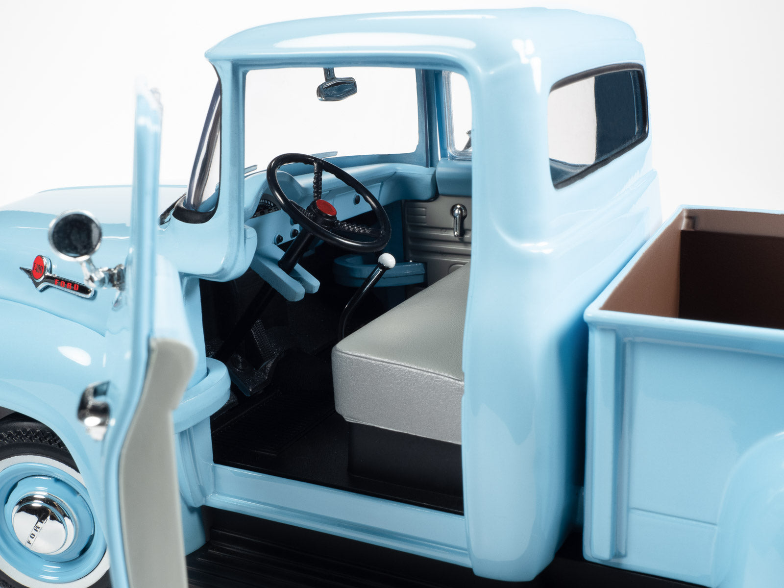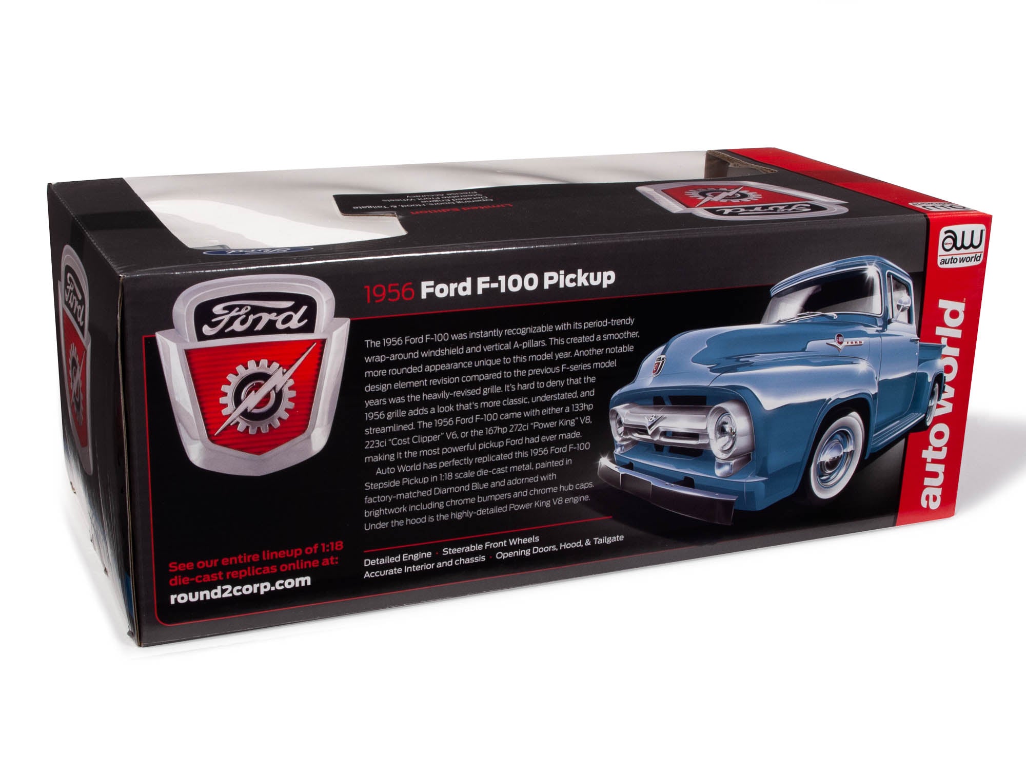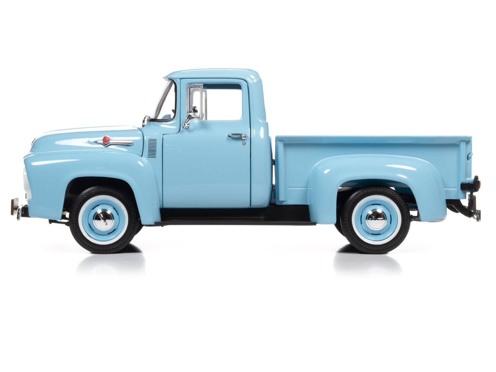 Auto World has perfectly replicated this 1956 Ford F-100 Stepside Pickup in 1:18 scale die-cast metal, painted in factory-matched Diamond Blue and adorned with brightwork including chrome bumpers and chrome hub caps. Under the hood is the highly-detailed Power King V8 engine.