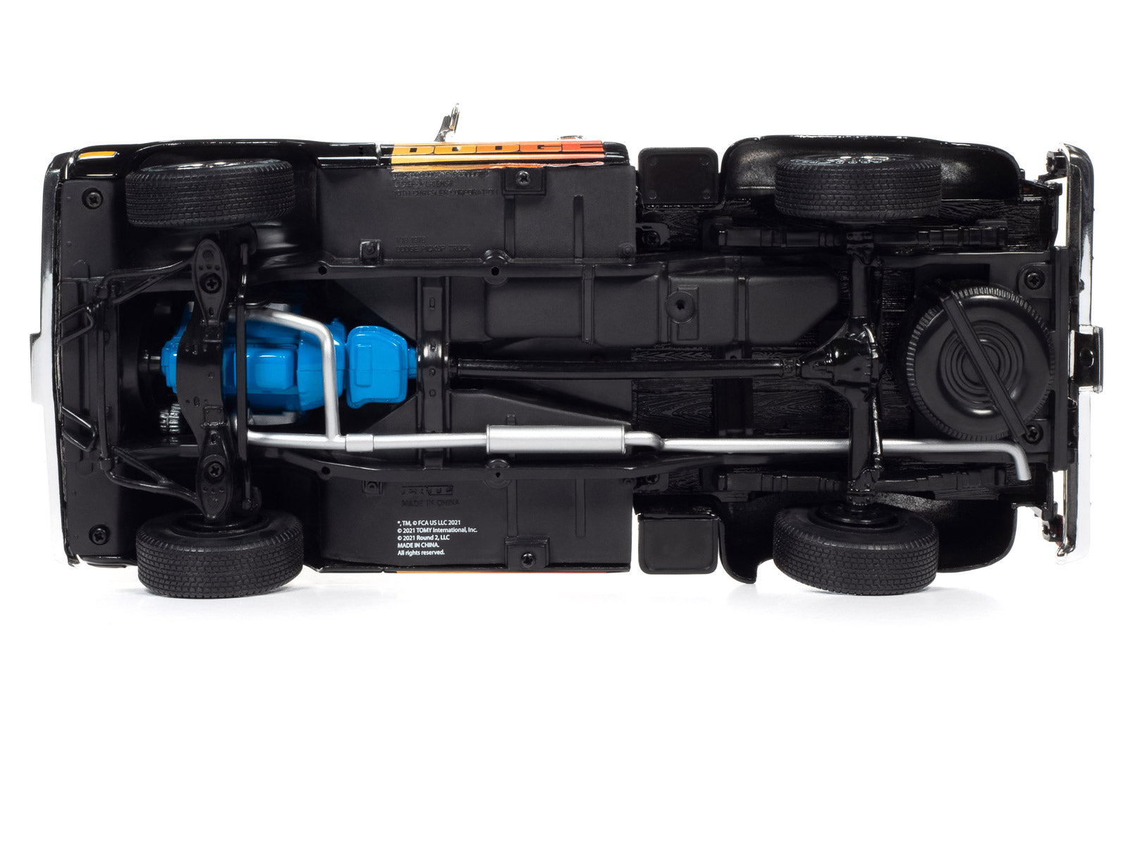 The custom-truck scene blossomed into a lifestyle on the West Coast, with trucks of all types used to haul cool toys. Dodge capitalized on this trend by creating adult toys with special graphics packages across many of their vehicle lines. This particular black exterior body includes the traditional Utiline bed and custom trim referred to as Gradated Sport Stripes. The multi-colored stripes consists of large DODGE lettering at the bottom of the doors that go from the rockers up and run to the back of the truck. The tailgate has huge PICK-M-UP lettering as well as matching stripes which wrap around the top of the hood.