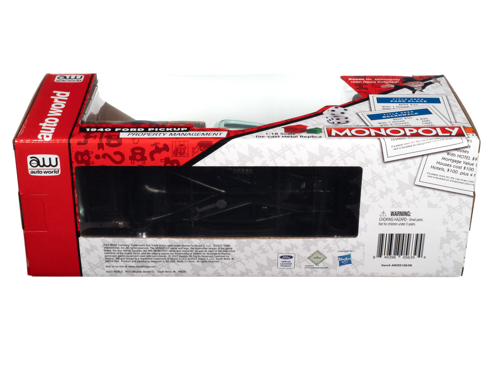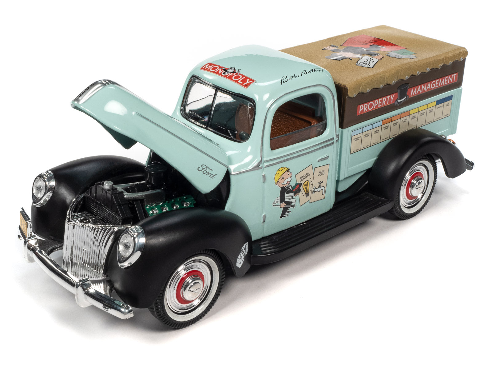 This 1:18 scale die-cast 1940 Ford pickup from Auto World is decorated with Monopoly graphics and is just right for all the accouterments of a property manager. Also included is a resin figure of a very busy Mr. Monopoly.